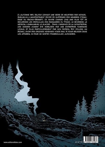 A l'automne 1917, Halifax connait une série de meurtres par noyade. Quelqu'un a manifestement décidé de supprimer des membres d'équipage du Mackay-Bennett, ce navire chargé cinq ans plus tôt de récupé-rer les dépouilles des passagers du Titanic. Croque-mort, révérend, médecin, embaumeur, glacier... Dans l'urgence de la catastrophe, cette équipe avait été réunie par une entreprise funéraire locale ; et plus par-ticulièrement par son patron, Roy Collins, un Micmac. Avoir des origines indiennes n'aide pas. Ni pour ré-ussir dans les affaires, ni pour se sortir d'embrouilles judiciaires.