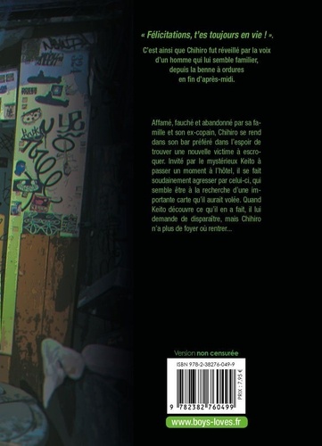 "Félicitations, t'es toujours en vie ! " C'est ainsi que Chihiro fut réveillé par la voix d'un homme qui lui semble familier, depuis la benne à ordures en fin d'après-midi. Affamé, fauché et abandonné par sa famille et son ex-copain, Chihiro se rend dans son bar préféré dans l'espoir de trouver une nouvelle victime à escroquer. Invité par le mystérieux Keito à passer un moment à l'hôtel, il se fait soudainement agresser par celui-ci, qui semble être à la recherche d'une importante carte qu'il aurait volée. Quand Keito découvre ce qu'il en a fait, il lui demande de disparaître, mais Chihiro n'a plus de foyer où rentrer...