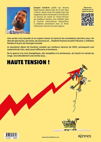 Une année s'est écoulée et nous laissons enfin le Covid derrière nous. On se remet à organiser nos vacances, nos voyages... On oublie les inondations, le soleil revient et Vladimir Poutine envahit l'Ukraine. L'inflation flambe, les oeufs en chocolat fondent. Les centrales nucléaires ferment et le prix de l'énergie s'envole. Retrouvez ici le douzième album de Sondron, rempli des meilleurs dessins qui ont fait l'actualité de cette année 2022, une compilation de rires et de joies, mais aussi de réflexion et d'émotion. De la guerre à la crise énergétique, des personnalités décédées aux présidentielles françaises, du Covid à la Variole du singe, une année décidément sous Haute tension !