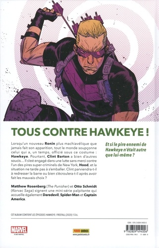 Clint Barton a un temps endossé le costume de Ronin, aussi quand un nouveau personnage portant ce même costume, sème la panique en ville, les soupçons se portent tout naturellement sur Hawkeye. Celui-ci se retrouve bien malgré lui pris dans une guerre de gangs entre ce nouveau Ronin et Hood. Quel camp Barton va-t-il choisir ? Qui est ce nouveau Ronin ? Spider-Man et Daredevil pourront-ils aider le héros ? Matthew Rosenberg (Punisher) et Otto Schmidt (Green Arrow) sont aux rênes de cette mini-série shootée à l'adrénaline. Une bonne façon de se tenir informés des activités de Clint Barton, avant qu'une série consacrée à Hawkeye ne sorte sur Disney+ en fin d'année !
