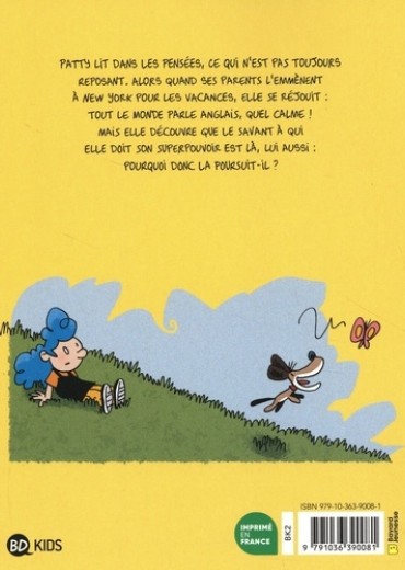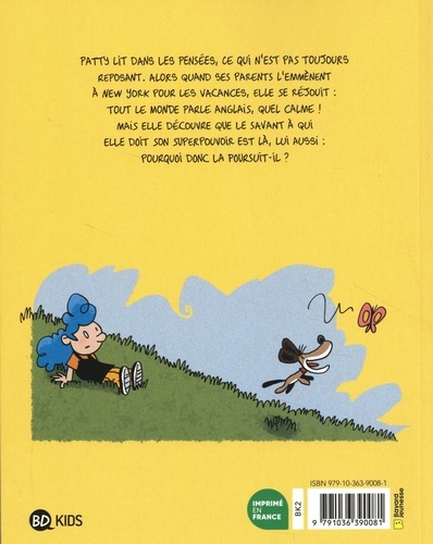 Patty, est une petite fille qui lit dans les pensées. Dans ce nouveau tome, elle part en voyage à New York... Là, elle découvre que le savant à qui elle doit son super pouvoir est lui aussi aux Etats-Unis : mais pourquoi la poursuit-il ? Une série signée Lewis Trondheim Lewis Trondheim, auteur notamment de la série Lapinot (L'association), mais aussi de Donjon avec Joann Sfar (Delcourt) et, chez Bayard jeunesse, de Chihuahua avec Nob, Jousselin et Obion, revient en solo pour cette série drôle et déjantée. Un superpouvoir pas comme les autres Patty peut deviner les sujets des interros, aider les personnes qui n'osent pas le demander, ou connaître les pensées secrètes de son chien, qui lui voue une totale admiration. Qui ne voudrait pas être à sa place ?