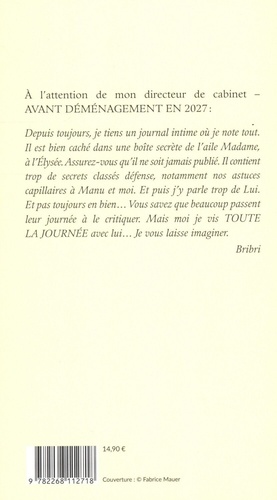 A l'attention de mon directeur de cabinet - Avant déménagement en 2027 : Depuis toujours, je tiens un journal intime où je note tout. Il est bien caché dans une boîte secrète de l'aile Madame, à l'Elysée. Assurez-vous qu'il ne soit jamais publié. Il contient trop de secrets classés défense, notamment nos astuces capillaires à Manu et moi. Et puis j'y parle trop de Lui. Et pas toujours en bien... Vous savez que beaucoup passent leur journée à le critiquer. Mais moi je vis toute la journée avec lui... Je vous laisse imaginer. Bribri