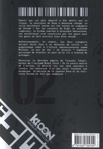 Depuis que son père adoptif a été abattu par un insane, le quotidien de Roue a beaucoup changé... La voilà maintenant lancée sur les routes en compagnie de Chrome ! Sur les conseils de Kidd, un androïde ingénieur, le binôme cherche à atteindre Heavenland, une mystérieuse cité construite par les gears pour les gears oú Zett pourrait bien être ranimé. Malheureusement, en chemin, les deux voyageurs doivent faire face à un obstacle de taille : un gigantesque robot à l'allure impressionnante nommé Wilhelm, le mur de fer ! Sa mission ? Empêcher quiconque de franchir le pont qu'on lui a ordonné de protéger. Découvrez la dernière pépite de Tsuyoshi Takaki, auteur de l'acclamé Black Torch ! On le savait maître de l'action, il dévoile ici son côté sensible à travers les aventures d'un duo aussi touchant que dynamique. Le périple de la joyeuse Roue et du taciturne Chrome ne fait que commencer !