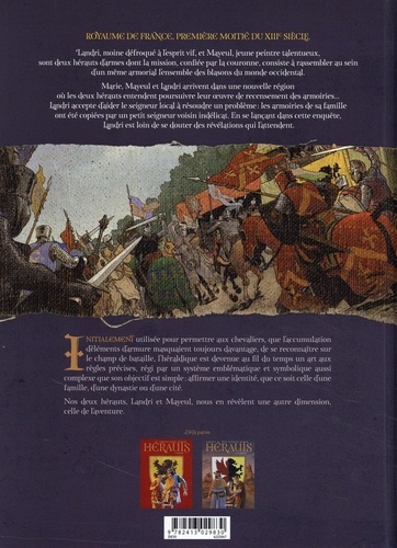 L'art héraldique a baigné nos cours d'histoire et marqué durablement nos mémoires, associant ces blasons au Moyen Age et à ses chevaliers. Mais il s'agit aussi d'une écriture par l'image, aux codes et aux règles strictes Marie, Mayeul et Landri arrivent dans une nouvelle région où les deux hérauts entendent poursuivre leur oeuvre de recensement des armoiries... Landri accepte d'aider le seigneur local à résoudre un problème : les armoiries de sa famille ont été copiées par un petit seigneur voisin indélicat. En se lançant dans cette enquête, Landri est loin de se douter des révélations qui l'attendent.
