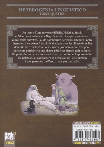 Au terme d'une traversée difficile, Hakaba, Susuki et Meuh sont arrivés au village de ce dernier, que le professeur aurait visité autrefois. Là, de nombreuses péripéties attendent notre linguiste : il va peiner à établir le dialogue avec les villageois, se lier d'amitié avec quelqu'un dont il ignore jusqu'au nom et l'espèce, ou encore participer à une chasse périlleuse dans le noir complet. Sa persévérance sera mise à rude épreuve tandis qu'il approfondira ses réflexions et confrontera sa défi-nition de l'être humain à une personne qui l'est... mais pas tout à fait.