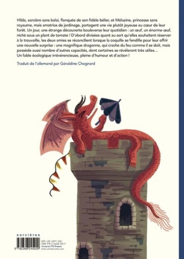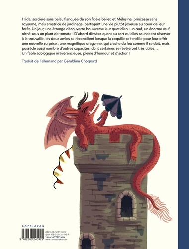 Hilda, sorcière sans balai, flanquée de son fidèle bélier, et Mélusine, princesse sans royaume, mais amatrice de jardinage, partagent une vie plutôt joyeuse au coeur de leur forêt. Un jour, une étrange découverte bouleverse leur quotidien : un oeuf, un énorme oeuf, niché sous un plant de tomate ! D'abord divisées quant au sort qu'elles souhaitent réserver à la trouvaille, les deux amies se réconcilient lorsque la coquille se fendille pour leur offrir une nouvelle surprise : une magnifique dragonne, qui crache du feu comme il se doit, mais possède aussi nombre d'autres capacités, dont certaines se révéleront très utiles... Un fable écologique irrévérencieuse, pleine d'humour et d'action !