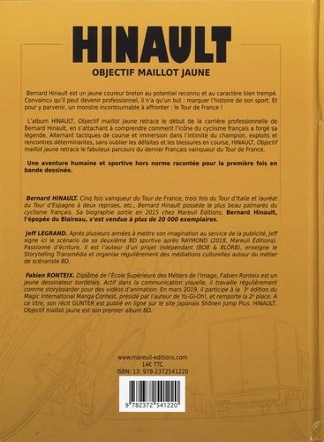 " Objectif jaune " retrace le début de carrière professionnelle de Bernard, en s'attelant à comprendre comment le personnage du Blaireau s'est créé. Bernard Hinault est un jeune coureur breton au potentiel reconnu, et au caractère bien trempé. Les seules choses plus dures que sa tête sont ses jambes et sa farouche volonté de vaincre. Il n'a qu'un but : inscrire son histoire dans celle de son sport. Hinault, ce n'est pas un ovni. C'est un missile téléguidé qui atteint toujours sa cible. D'exploits en rencontres déterminantes, en passant par les défaites et les blessures, Le Blaireau met en lumière la carrière du champion pour la première fois en bande dessinée.