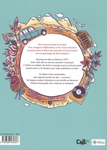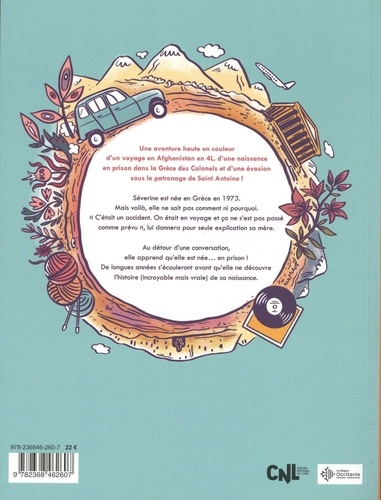 Une aventure haute en couleur d'un voyage en Afghanistan en 4L, d'une naissance en prison dans la Grèce des Colonels et d'une évasion sous le patronage de Saint Antoine ! Séverine est née en Grèce en 1973. Mais voilà, elle ne sait pas comment ni pourquoi. "C'était un accident. On était en voyage et ça ne s'est pas posé comme prévu", lui donnera pour seule explication sa mère. Au détour d'une conversation, elle apprend qu'elle est née... en prison ! De longues années s'écouleront avant qu'elle ne découvre l'histoire (incroyable mois vraie) de sa naissance.