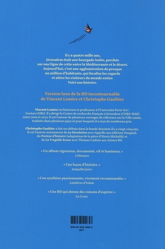 Il y a quatre mille ans, Jérusalem était une bourgade isolée, perchée sur une ligne de crête entre la Méditerranée et le désert. Aujourd'hui, c'est une agglomération de presque un million d'habitants, qui focalise les regards et attire les visiteurs du monde entier. Voici son histoire. Version luxe de la BD incontournable de Vincent Lemire et Christophe Gaultier " Un album rigoureux, documenté, vif et lumineux. " - ; L'Histoire " Une leçon d'histoire. " - ; Actualité Juive " Une synthèse passionnante, vivement recommandée. " - ; Lumières d'Islam " Une BD qui donne des raisons d'espérer. " - ; La Croix