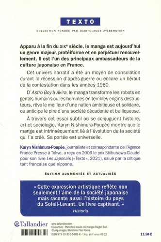 Cet univers narratif a été un moyen de consolation durant la récession d'après-guerre ou encore un héraut de la contestation dans les années 1960. D'Astro Boy à Akira, le manga transforme les robots en gentils humains ou les hommes en terribles engins destructeurs, rêve le meilleur d'une nation ambitieuse et solidaire, ou anticipe le pire d'une société décadente et belliqueuse. A travers cet essai subtil où se conjuguent histoire, art et sociologie, Karyn Nishimura-Poupée montre que le manga est intrinsèquement lié à l'évolution de la société qui l'a créé. Sa portée est universelle.
