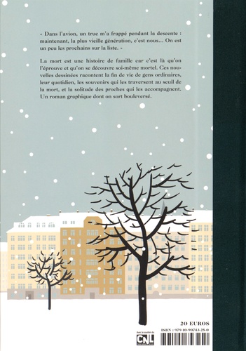«Dans l'avion, un truc m'a frappé pendant la descente : maintenant, la plus vieille génération, c'est nous... On est un peu les prochains sur la liste.» La mort est une histoire de famille car c'est là qu'on l'éprouve et qu'on se découvre soi-même mortel. Ces nouvelles dessinées racontent la fin de vie de gens ordinaires, leur quotidien, les souvenirs qui les traversent au seuil de la mort, et la solitude des proches qui les accompagnent. Un roman graphique dont on sort bouleversé.