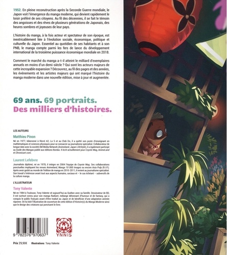 1952. En pleine reconstruction après la Seconde Guerre mondiale, le Japon voit l'émergence du manga moderne, qui devient rapidement le loisir préféré de ses citoyens. Au fil des décennies, il se fait le témoin des angoisses et des rêves de plusieurs générations de Japonais, des heures sombres et joyeuses de leur pays. L'histoire du manga, à la fois acteur et spectateur de son époque, est inextricablement liée à l'évolution sociale, économique, politique et culturelle du Japon. Essentiel au quotidien de ses habitants et à son PNB, le manga compte parmi les fers de lance du développement international de la troisième puissance économique mondiale en 2018. Comment le marché du manga a-t-il atteint le milliard d'exemplaires annuels en moins d'un demi-siècle ? Qui sont les acteurs majeurs de cette incroyable expansion ? Découvrez, au fil des pages et des années, les événements et les artistes majeurs qui ont marqué l'histoire du manga moderne dans une nouvelle édition, mise à jour et augmentée. 69 ans. 69 portraits. Des milliers d'histoires.