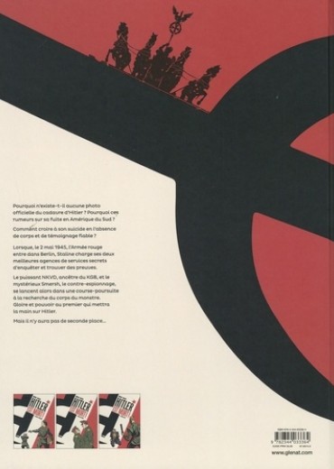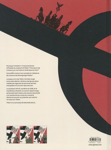 Sur les traces du Führer... l'impossible vérité. Berlin, 1946. Pour Moscou, le mystère autour de la mort d'Hitler est officiellement clos. Le dictateur est bel et bien mort. A moins que... Une unité d'élite de l'Armée rouge donne l'alerte : on aurait retrouvé le Führer vivant. Peut-être s'agit-il d'un sosie. Leur découverte jette l'effroi et le doute. Il n'en faut pas plus pour relancer les hostilités entre les deux meilleurs services secrets soviétiques. D'un côté le NKVD, de l'autre le redoutable service de contre-espionnage du Smersh. Dans le plus grand secret, le NKVD reprend à zéro les interrogatoires et dépêche le meilleur légiste russe à Berlin pour enquêter... C'est l'Opération Mythe. Entre règlements de comptes internes, mensonges et dissimulations, la vérité du plus fort pourrait l'emporter... Ce thriller fascinant clôt la trilogie basée sur des documents conservés dans les archives militaires de la Russie. Jean-Christophe Brisard tire le meilleur de ses sources, en compagnie d'Alberto Pagliaro, qui s'avère le dessinateur idéal pour mettre en images ce moment d'Histoire paranoïaque. Un album passionnant, agrémenté d'un dossier historique de huit pages, sur un sujet qui continue d'alimenter aujourd'hui encore toutes les théories...