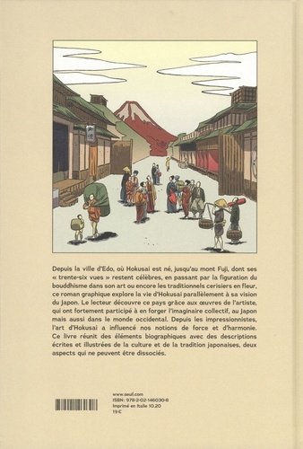 Depuis la ville d'Edo, où Hokusai est né, jusqu'au Mont Fuji, dont ses "trente-six vues" restent célèbres, en passant par la figuration du bouddhisme dans son art ou encore les traditionnels cerisiers en fleurs, ce roman graphique explore la vie d'Hokusai parallèlement à sa vision du Japon. Le lecteur découvre ce pays grâce aux oeuvres de l'artiste, qui ont fortement participé à en forger l'imaginaire collectif, au Japon mais aussi dans le monde occidental. Depuis les impressionnistes, l'art d'Hokusai a influencé nos notions de force et d'harmonie. Ce roman graphique réunit des éléments biographiques avec des descriptions écrites et illustrées de la culture et de la tradition japonaises, deux aspects qui ne peuvent être dissociés.