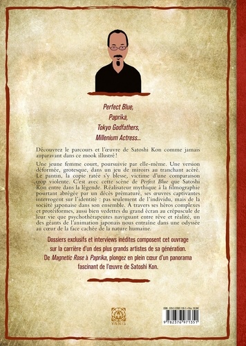Perfect Blue, Paprika, Tokyo Godfathers, Millenium Actress... Découvrez le parcours et l'oeuvre de Satoshi Kon comme jamais auparavant dans ce mook illustré! Une jeune femme court, poursuivie par elle-même. Une version déformée, grotesque, dans un jeu de miroirs au tranchant acéré. Le pantin, la copie ratée s'y blesse, victime d'une comparaison trop violente. C'est avec cette scène de Perfect Blue que Satoshi Kon entre dans la légende. Réalisateur mythique à la filmographie pourtant abrégée par un décès prématuré, ses oeuvres captivantes interrogent sur l'identité : pas seulement de l'individu, mais de la société japonaise dans son ensemble. A travers ses héros complexes et protéiformes, aussi bien vedettes du grand écran au crépuscule de leur vie que psychothérapeutes naviguant entre rêve et réalité, un des géants de l'animation japonais nous entraîne dans une odyssée au coeur de la face cachée de la nature humaine.