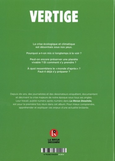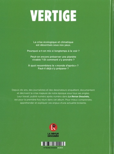 "Qui aurait pu prédire la crise climatique aux effets spectaculaires ? " , se demandait Emmanuel Macron lors de ses voeux aux Français, le 31 décembre dernier. Depuis sa création il y a dix ans, La Revue Dessinée n'a eu de cesse de proposer, dans chacun de ses quarante numéros, de riches enquêtes en bande dessinée sur les crises climatique et écologique qui secouent le monde. L'une d'elles est même devenue un album best-seller : Algues vertes, l'histoire interdite. Beaucoup d'autres ont documenté ce monde qui, sous nos yeux, se transforme à toute vitesse, à en faire tourner la tête. VERTIGE -, dix ans d'enquêtes sur la crise écologique et climatique rassemble pour la première fois dans un seul et même album les plus emblématiques. Le réchauffement climatique, ses conséquences en cascade liées à sa prise en compte tardive ; l'agro-industrie et son héritage parfois empoisonné, comme avec les algues vertes en Bretagne ou le chlordécone aux Antilles ; la biodiversité menacée, entre extinction massive, compensations aux allures de green- washing et sauvetage à la carte des espèces ; les limites de la planète, qui voit ses ressources les plus rares surexploitées et incite certains à se préparer à une potentielle nouvelle ère, celle de l'effondrement... VERTIGE aborde l'ensemble de ces enjeux d'une actualité brûlante, pour mieux les comprendre, les appréhender et les expliquer.