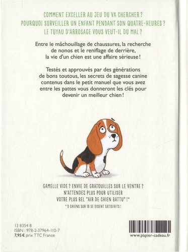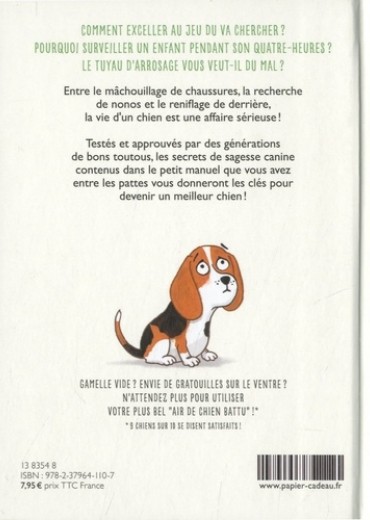 Comment exceller au jeu du va chercher ? pourquoi surveiller un enfant pendant son quatre-heures ? le tuyau d'arrosage vous veut-il du mal ? Entre le mâchouillage de chaussures, la recherche de nonos et le reniflage de derrière, la vie d'un chien est une affaire sérieuse ! Testés et approuvés par des générations de bons toutous, les secrets de sagesse canine contenus dans le petit manuel que vous avez entre les pattes vous donneront les clés pour devenir un meilleur chien ! GAMELLE VIDE ? ENVIE DE GRATOUILLES SUR LE VENTRE ? N'ATTENDEZ PLUS POUR UTILISER VOTRE PLUS BEL "AIR DE CHIEN BATTU" ! 9 CHIENS SUR 10 SE DISENT SATISFAITS !