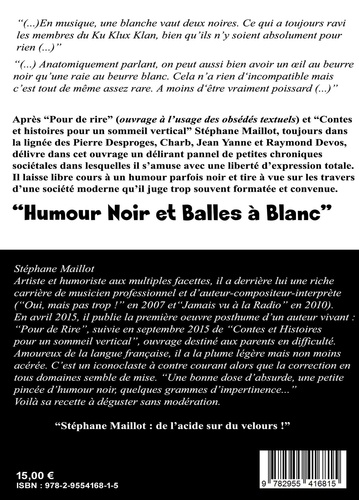 "(...)En musique, une blanche vaut deux noires. Ce qui a toujours ravi les membres du Ku Klux Klan, bien qu'ils n'y soient absolument pour rien (...)" "(...) Anatomiquement parlant, on peut aussi bien avoir un oeil au beurre noir qu'une raie au beurre blanc. Cela n'a rien d'incompatible mais c'est tout de même assez rare. A moins d'être vraiment poissard (...)" Après "Pour de rire" (ouvrage à l'usage des obsédés textuels) et "Contes et histoires pour un sommeil vertical" Stéphane Maillot, toujours dans la lignée des Pierre Desproges, Charb, Jean Yanne et Raymond Devos, délivre dans cet ouvrage un délirant pannel de petites chroniques sociétales dans lesquelles il s'amuse avec une liberté d'expression totale.