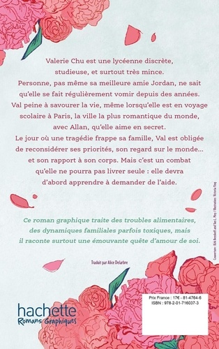 Valerie Chu est une lycéenne discrète, studieuse, et surtout très mince. Personne, pas même sa meilleure amie Jordan, ne sait qu'elle se fait régulièrement vomir depuis des années. Val peine à savourer la vie, même lorsqu'elle est en voyage scolaire à Paris, la ville la plus romantique du monde, avec Allan, qu'elle aime en secret. Le jour où une tragédie frappe sa famille, Val est obligée de reconsidérer ses priorités, son regard sur le monde... et son rapport à son corps. Mais c'est un combat qu'elle ne pourra pas livrer seule : elle devra d'abord apprendre à demander de l'aide. Ce roman graphique traite des troubles alimentaires, des dynamiques familiales parfois toxiques, mais il raconte surtout une émouvante quête d'amour de soi.
