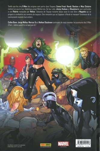 Alors qu'une maléfique alliance se noue entre Emma Frost, Bastion, Havok et Miss Sinistre, les jeunes X-Men des origines, toujours coincés à notre époque, se retrouvent également perdus dans l'espace ! Une nouvelle équipe doit se former pour contrecarrer les plans des Mauvais Mutants, et c'est Magnéto qui est à leur tête ! Mais ces événements risquent bien d'entraîner le Maître du Magnétisme sur le chemin du mal qu'il avait pourtant juré de laisser derrière lui. A l'occasion de Marvel NOW ! , Brian Michael Bendis fait venir les X-Men des origines à notre époque, à l'âge qu'ils avaient quand le Professeur X les a recrutés pour la première fois. Depuis, les aventures des jeunes Cyclope, Jean Grey, Angel, Iceberg et le Fauve sont au coeur des intrigues mutantes, et cet album marque un tournant décisif dans leurs vies !