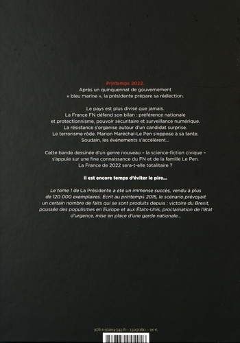 Printemps 2022. Après un quinquennat de gouvernement "bleu marine", la présidente prépare sa réélection. Le pays est plus divisé que jamais. La France FN défend son bilan : préférence nationale et protectionnisme, pouvoir sécuritaire et surveillance numérique. La résistance s'organise autour d'un candidat surprise. Le terrorisme rôde. Marion Maréchal-Le Pen s'oppose à sa tante. Soudain, les événements s'accélèrent... Cette bande dessinée d'un genre nouveau - la science-fiction civique - s'appuie sur une fine connaissance du FN et de la famille Le Pen. La France de 2022 sera-t-elle totalitaire ? Il est encore temps d'éviter le pire... Le tome 1 de La Présidente a été un immense succès, vendu à plus de 120 000 exemplaires. Ecrit au printemps 2015, le scénario prévoyait un certain nombre de faits qui se sont produits depuis : victoire du Brexit, poussée des populismes en Europe et aux Etats-Unis, proclamation de l'état d'urgence, mise en place d'une garde nationale...