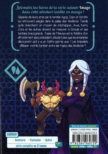 Retrouvez les héros de le série animée Imago dans cette aventure inédite en manga ! Séparés de leurs amis par la terrible Agoji, Zayn et Azrohk se retrouvent piégés dans le palois des ténèbres Tandis . qu'ils cherchent un moyen de s'échapper, Awa, Kemi, Zora et les autres doivent se mesurer à Ghouls et ses terribles bracognards : l'oasis de Melwiya est le théâtre d'un affrontement sans précédent, d'autant plus que les arkanistes découvrent qu'il y a un traître parmi eux ! Les bracelets d'lsbanir vont-ils tomber entre les mains des ténèbres ?