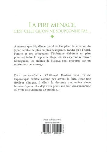 Dans Immortalité et Châtiment, Kentarô Satô revisite l'apocalypse zombie comme peu savent le faire. Avec une froideur clinique, il décrit la descente aux enfers d'une humanité qui semble déjà avoir perdu son âme, dans un monde où vivre est synonyme de punition... A mesure que l'épidémie prend de l'ampleur, la situation du Japon semble de plus en plus désespérée. Tandis qu'à l'hôtel, Fumito et ses compagnes d'infortune élaborent un plan pour rejoindre le septième étage, où ils espèrent retrouver Kamegaoka, les enfants de Misawa sont secourus par un mystérieux personnage...