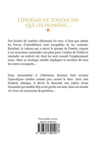 Avec Immortalité et Châtiment, Kentarô Satô revisite l'apocalypse zombie comme peu savent le faire. De manière aussi froide que clinique, il décrit la descente aux enfers d'une humanité qui semble déjà avoir perdu son âme, dans un monde où vivre est synonyme de punition... Des hordes de zombies sillonnent les rues, si bien que même les Forces d'autodéfense sont incapable de les contenir. Kazahari, le yakuza qui a sauvé le groupe de Fumito, expose à ses nouveaux camarades son plan pour s'enfuir de l'hôtel et rejoindre un endroit sûr dont lui seul connaît l'emplacement exact. Mais celui-ci semble impliquer le sacrifice de tous les autres résidents de l'hôtel...