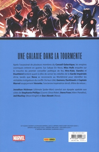 Une galaxie dans la tourmente. Après l'assassinat de plusieurs membres du Conseil Galactique, les empires cosmiques entrent en guerre. Sur Sakaar En Nevo, Miss Hulk enquête sur le meurtre du premier conseiller politique de feu Hiro-Kala. Xandra et Deathbird tentent quant à elles de semer les rebelles de la Garde Impériale shi'ar, tandis que Nova se reconnecte au Worldmind pour identifier les véritables instigateurs du conflit. De leur côté, Gamora, Darkhawk et Captain Marvel soupçonnent Veranke, l'ancienne impératrice skrull, d'être de retour... Jonathan Hickman (Ultimate Spider-Man) conclut son épopée spatiale aux côtés de Stephanie Phillips (Cosmic Ghost Rider), Steve Foxe (Alien : Paradiso), Jed MacKay (Moon Knight) et Dan Abnett (Nova).