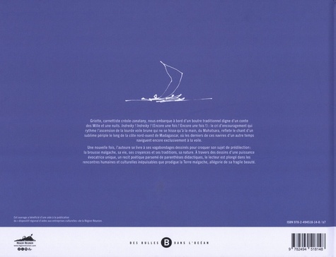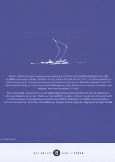 Griotte, carnettiste créole-zanatany, nous embarque à bord d'un boutre traditionnel digne d'un conte des Mille et une nuits. Indreiky ! Indreiky ! (Encore une fois ! Encore une fois ! ) le cri d'encouragement qui rythme l'ascension de la lourde voile brune qui ne se hisse qu'à la main, du Mahatsara, reflète le chant d'un sublime périple le long de la cote nord-ouest de Madagascar, où les derniers de ces navires d'un autre temps naviguent encore exclusivement à la voile. Une nouvelle fois, l'auteur se livre à ses vagabondages dessinés pour croquer son sujet de prédilection : la brousse malgache, sa vie, ses croyances et ses traditions, sa nature. A travers des dessins d'une puissance évocatrice unique, un récit poétique parsemé de parenthèses didactiques, le lecteur est plongé dans les rencontres humaines et culturelles inépuisables que prodigue la Terre malgache, allégorie de sa fragile beauté.