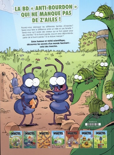 La série "anti-bourdon" qui ne manque pas de z'ailes ! Savez-vous comment distinguer les différentes familles d'insectes ? Savezvous qu'il existe des chenilles qui se font passer pour des serpents pour se protéger ? Mais savez-vous qu'il existe aussi des oiseaux qui se font passer pour des chenilles ? Et la fourmi panda, vous la connaissez, la fourmi panda ? Et le réduve masqué ? Tous vous donnent rendez-vous dans ce nouveau tome où on apprend des tas de choses sur les petites bêtes à six pattes tout en s'amusant ! Une BD qui ne vous donnera pas le bourdon ni le cafard !