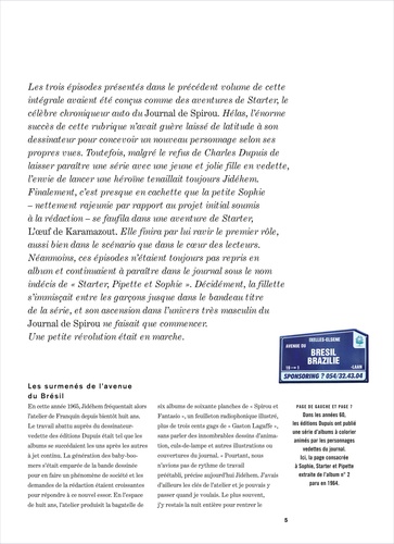 Ce volume réunit pour la première fois "Les aventures de Sophie" publiées dans le Journal de Spirou entre 1965 et 1969, dans l'ordre chronologique de leur parution. Nous les retrouvons dans les albums ci-dessus. Après trois épisodes dont Starter était le personnage principal, la petite Sophie, d'abord conçue comme un second rôle, commence à lui ravir la vedette. Avec elle, Jidéhem s'affranchit peu à peu de l'influence de Franquin - auprès duquel il dessinait Gaston Lagaffe depuis huit ans - et lance un de ces personages mythiques qui firent l'âge d'or du Journal de Spirou.