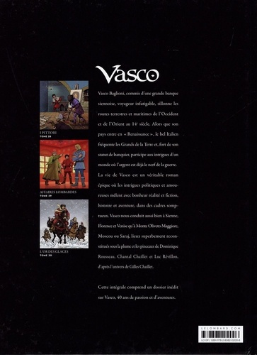 Vasco Baglioni, commis d'une grande banque siennoise, voyageur infatigable, sillonne les routes terrestres et maritimes de l'Occident et de l'Orient au Me siècle. Alors que son pays entre en "Renaissance", le bel Italien fréquente les Grands de la Terre et, fort de son statut de banquier, participe aux intrigues d'un monde où l'argent est déjà le nerf de la guerre. La vie de Vasco est un véritable roman épique où les intrigues politiques et amoureuses mêlent avec bonheur réalité et fiction, histoire et aventure, dans des cadres somptueux. Vasco nous conduit aussi bien à Sienne, Florence et Venise qu'à Monte Oliveto Maggiore, Moscou ou Saraj, lieux superbement reconstitués sous la plume et les pinceaux de Dominique Rousseau, Chantal Chaillet et Luc Révillon, d'après l'univers de Gilles Chaillet.