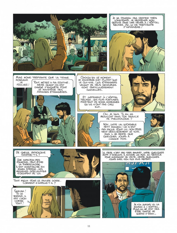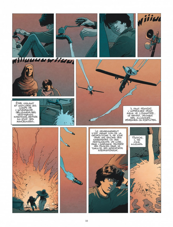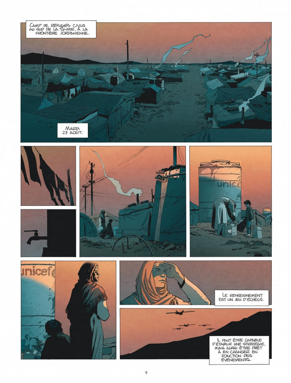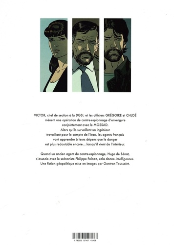 2019 : le port stratégique syrien de Lattaquié est dorénavant tenu par l'Iran. Le risque est immense que les gardiens de la révolution l'utilisent pour faire entrer des armes, faisant ainsi du Proche-Orient une véritable poudrière. Au sein de la DGSI, le commandant Mougin dirige l'équipe en charge du contre-espionnage iranien. C'est donc sur le territoire français que Grégoire, ancien flic de la PJ, Eliott, Antoine, Chloé et Anaïs opèrent, en coordination avec les services secrets israéliens, pour obtenir des renseignements. "Siamois" , l'un des ingénieurs chargés par Téhéran de la prise en main du port de Lattaquié, est suspecté de détenir des informations sur les sites de lancement de missiles iraniens installés en Syrie. Et il se rend justement à Paris pour rejoindre son fils soigné à l'hôpital Necker : l'occasion parfaite d'engager une filature et de piéger son ordinateur. Mais le Mossad et la DGSI ne sont pas les seuls à s'intéresser à ce port : la Russie avance aussi ses pions, depuis les couloirs de l'ambassade à Paris jusqu'à l'aéroport de Roissy. Ce jeu d'échecs risque de devenir un jeu de dupes... Tout autant un précis de géopolitique qu'un récit d'espionnage à la construction magistrale, Intelligences est le résultat de l'association inédite d'un ancien agent du contre-espionnage, Hugo de Bénat, à un scénariste expérimenté, Philippe Pelaez (Six, Epouvantail). Il ne manquait plus que le dessin réaliste et précis de Gontran Toussaint pour en faire une captivante fiction politique.