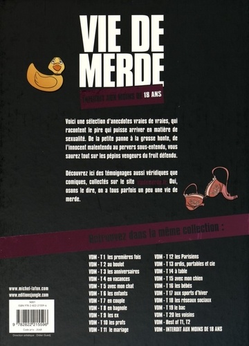 Voici une sélection d'anecdotes vraies de vraies, qui racontent le pire qui puisse arriver en matière de sexualité. De la petite panne à la grosse honte, de l'innocent malentendu au pervers sous-entendu, vous saurez tout sur les pépins vengeurs du fruit défendu. Découvrez ici des témoignages aussi véridiques que comiques, collectés sur le site viedemerde. Oui, osons le dire, on a tous parfois un peu une vie de merde.