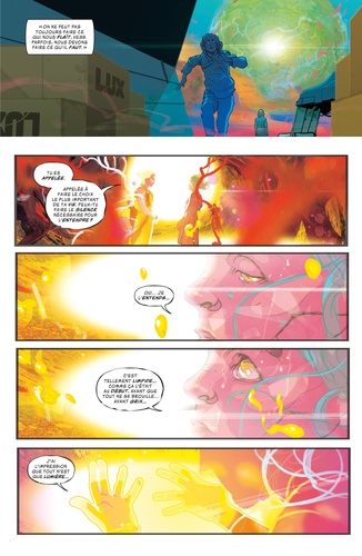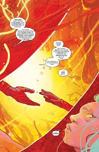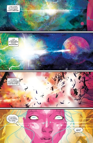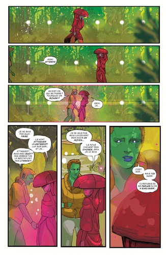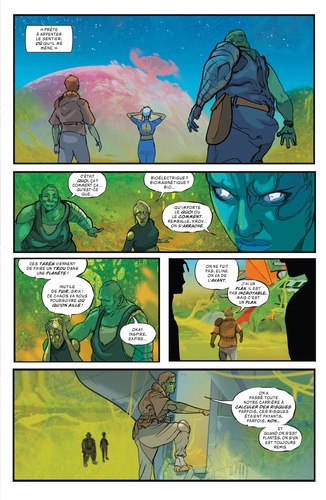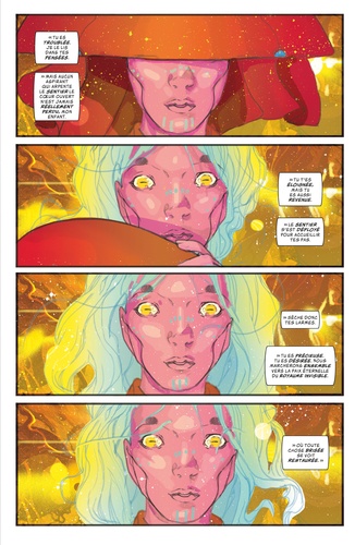 Sélection officielle du FIBD 2021 Eisner Award 2020 de la meilleure nouvelle série Eisner Award 2020 du meilleur artiste numérique Lorsque le sentier est une impasse, il ne reste que la révolution. A peine remis des périls la Couronne de Broque, Grix, Vess et tout l'équipage du Sundog sont contraints de suivre une mystérieuse faction de non-uns : les Soeurs de la Résurrection. Ensemble, ils atteignent l'endroit le plus reculé et le plus mortel du cosmos : le Point de Non-Retour. La fuite est désormais impossible, et tandis que la révolte gronde, Vess est confrontée à une révélation choquante. Les soeurs de la Résurrection ont un objectif indicible, et elles ont besoin d'elle pour le mener à bien, quitte à écarter Grix. Mais à qui faire confiance ? Vess choisira-t-elle le sentier de la destruction... ou celui de l'amour ? Grix tentera-t-elle l'impossible ? Découvrez le final grandiose et explosif de la série SF acclamée par la critique ! Troisième et dernier tome de la série portée parG. Willow Wilson (créatrice de Ms. Marvel) et Christian Ward (Black Bolt, Machine Gun Wizards...). " Un petit bijou de SF aux images et aux couleurs époustouflantes. " Planète BD " Un duo à l'alchimie évidente, se complétant harmonieusement dans une histoire profondément humaine. " LesComics. fr "De la SF grandiose, tout simplement". ComicsBlog " Un Star Wars pop-art, intelligent et féministe. " Publishers Weekly " Un space opera dynamique et riche de sens. " Syfy Wire " Invisible Kingdom est un récit de science-fiction surprenant, troublant, qui propose une approche politique de difficultés contemporaines, sous le vernis d'un cosmos étrange et crédible. Une oeuvre passionnante. " Top Comics