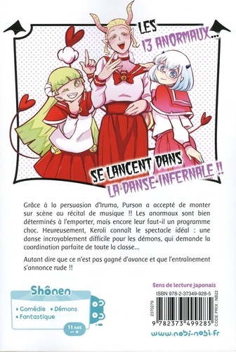 Les 13 anormaux se lancent dans la danse infernale !! Grâce à la persuasion d'Iruma, Purson a accepté de monter sur scène au récital de musique !! Les anormaux sont bien déterminés à l'emporter, mais encore leur faut-il un programme choc. Heureusement, Keroli connaît le spectacle idéal : une danse incroyablement difficile pour les démons, qui demande la coordination parfaite de toute la classe... Autant dire que ce n'est pas gagné d'avance et que l'entraînement s'annonce rude !!