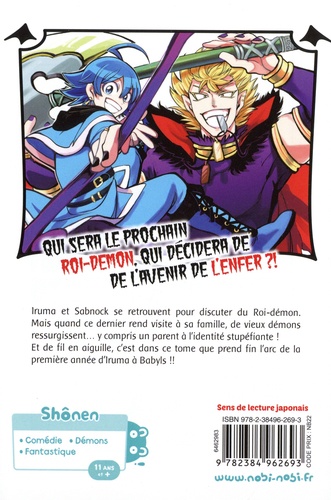 Iruma et Sabnock se retrouvent pour discuter du Roi-démon. Mais quand ce dernier rend visite à sa famille, de vieux démons ressurgissent... y compris un parent à l'identité stupéfiante ! Et de fil en aiguille, c'est dans ce tome que prend fin l'arc de la première année d'Iruma à Babyls !!