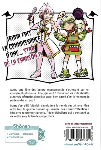 Après une fête des batora mouvementée s'achevant sur un époustouflant bouquet final, qui vaut à Iruma une visite des hautes autorités infernales dont il se serait bien passé, c'est le moment de se détendre un peu ! Iruma s'est déjà fait plein d'amis dans le monde des démons. Mais cette fois, le garçon humain qui n'aime pas attirer l'attention à l'école va rencontrer Kuromu, l'idole diabolique qui a consacré sa vie à être sous le feu des projecteurs...