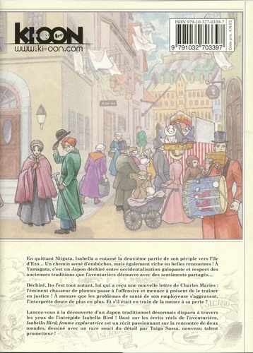Le Japon du XIXe siècle hors des sentiers battus ! En quittant Niigata, Isabella a entamé la deuxième partie de son périple vers l'île d'Ezo... Un chemin semé d'embûches, mais également riche en belles rencontres ! A Yamagata, c'est un Japon déchiré entre occidentalisation galopante et respect des anciennes traditions que l'aventurière découvre avec des sentiments partagés... Déchiré, Ito l'est tout autant, lui qui a reçu une nouvelle lettre de Charles Maries : l'éminent chasseur de plantes passe à l'offensive et menace à présent de le traîner en justice ! A mesure que les problèmes de santé de son employeuse s'aggravent, l'interprète doute de plus en plus. Et s'il était en train de la mener à sa perte ?