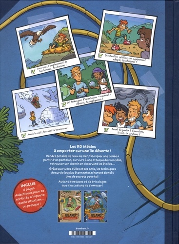 Facile de survivre sur une île déserte. Il suffit d'avoir les bonnes techniques. Alex, Faïza, Dieter et Charly ont échoué sur une île déserte. Avec leur débrouillardise, leur sens de l'observation et leur guide plein d'astuces, ils vont pouvoir aménager un camp digne de ce nom, fabriquer une boussole, un épurateur d'eau ou des pièges efficaces. Mais attention, l'île regorge de danger et la maladresse de Charly n'est pas le moindre. Retrouvez les héros de ISLAND dans une nouvelle série de gags bourrés d'humour et de trucs pour apprendre à observer la nature et à fabriquer une multitude d'objets pour y survivre.