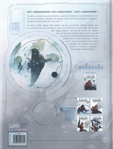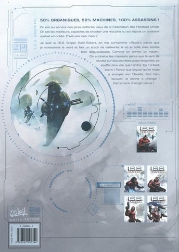 Je suis le I. S. S. Sniper Reid Eckart, on me surnomme Stock parce que je moissonne la mort et fais un stock de cadavres là où je colle mes bottes. Comme on arrive, on repart. On enchaîne les missions parce que le vent de révolte sur des planètes aussi éloignées, ça souffle plus vite que l'ordre. Ca, c'était avant ! Car depuis qu'on nous a envoyés sur Okeelia, faut bien l'avouer, la donne a changé !
