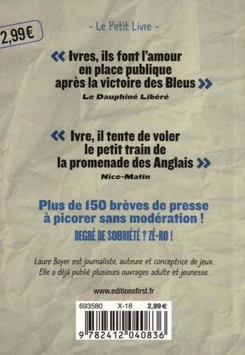 Des brèves à consommer... sans modération ! Un petit livre à picorer, plein de faits divers français avec des protagonistes qui n'ont pas su rester sobres... dans tous les sens du termes ! " Ivre, il se trompe de logement et boit une bière en caleçon chez sa voisine " - La Montagne " Ivre, l'automobiliste se soulage chez les gendarmes " - Les Dernières Nouvelles d'Alsace " Ivre, il tente de voler le petit train de la promenade des Anglais " - Le Télégramme " Ivre et insomniaque, il entre dans un fast-food et se cuisine un burger " - Le Dauphiné Libéré