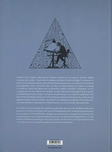 L'aventure dessinée d'Edgar P. Jacobs. Amateur d'art antique égyptien, collectionneur d'armes en tous genres, chanteur lyrique amoureux de la scène... Avant d'être le créateur de Blake et Mortimer, Edgar P. Jacobs est un homme d'une grande curiosité, animé par des passions nombreuses qui ont toute sa vie transporté son imagination. Ainsi, à 18 ans, il se rêve davantage en chanteur d'opéra qu'en dessinateur de bande dessinée. Malgré un passage à l'Académie royale des Beaux-Arts de Bruxelles, il préfère considérer le dessin comme un gagne-pain et non comme une véritable vocation. Mais la guerre arrive et dans les années 1940, les Allemands exigent que le contenu de la série américaine Flash Gordon soit repris et modifié. La tache revient à Jacobs qui fournit ensuite au journal les planches de sa première série : Le Rayon U. Plus tard, il rencontre Hergé, l'assiste sur Tintin- sans jamais être crédité - et finit par créer les aventures de deux héros anglais appelés à devenir des incontournables du genre : le colonel Francis Blake et le professeur Philip Mortimer. La bande dessinée est devenue son art et son métier, mais l'histoire de Jacobs ne s'arrête pas là... A l'occasion de l'anniversaire de la première publication des aventures de Blake et Mortimer dans le journal Tintin il y a 75 ans, voici le portrait biographique de l'un des plus grands auteurs du Neuvième Art. François Rivière, qui s'est longuement entretenu avec le maitre de son vivant, y raconte l'artiste au travers de nombreuses et fascinantes anecdotes qui ont constitué la vie de l'auteur belge. Philippe Wurm, l'un des héritiers évidents et revendiqués de la ligne Jacobs, met en scène cette fascinante destinée " à la manière de ", d'un trait fin et précis confondant de mimétisme. L'ouvrage se déclinera en deux éditions : Jacobs - Le rêveur d'apocalypses propose la bande dessinée complète en couleurs complétée d'un appareil critique succinct détaillant " l'homme Jacobs ". Jacobs - Le rêveur d'apocalypse - édition spéciale est l'édition luxe du même ouvrage, en noir et blanc, enrichie d'un appareil critique très dense (photographies, cartes postales, documents d'époque, notes, essais...) sur les coulisses de la création de l'oeuvre de Jacobs et les recherches effectuées par Wurm et Rivière. Car le moindre des paradoxes n'est pas que Jacobs a inventé des mondes et des voyages extraordinaires, aux quatre coins du monde et au-delà des univers connus, sans jamais quitter - ou presque - Bruxelles et ses environs...