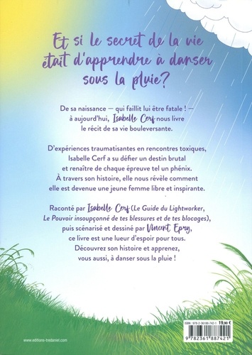 Malgré les épreuves, la belle histoire d'Isabelle, faite de renaissances et de résilience Dans cette BD intimiste, Isabelle Cerf nous dévoile son parcours de vie. Du jour de sa naissance, où elle a failli ne pas survivre, à aujourdhui, jeune femme épanouie de 37 ans. D'ailleurs, elle n'est pas née qu'une fois, mais cinq fois au cours de son existence. Cinq fois où, malgré la violence de la vie, elle est parvenue à renaître tel un Phoenix, animal qu'elle s'est tatoué sur le bras. Au travers de ses expériences traumatisantes, que ce soit avec des adultes défaillants, un environnement social compliqué et un destin pour le moins taquin, elle a appris à danser sous la pluie, pour devenir la jeune femme libre qu'elle est aujourd'hui. Elle souhaite, à travers son histoire, transmettre une lueur d'espoir à ceux qui n'en ont peut-être plus beaucoup, et les inviter à danser avec elle.