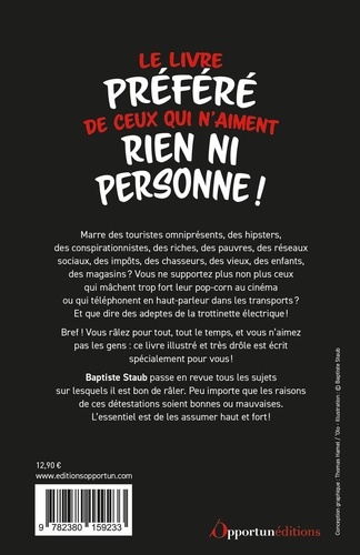 Marre des touristes omniprésents, des hipsters, des conspirationnistes, des riches, des pauvres, des réseaux sociaux, des impôts, des chasseurs, des vieux, des enfants, des magasins ? Vous ne supportez plus non plus ceux qui mâchent trop fort leur pop-corn au cinéma ou qui téléphonent en haut-parleur dans les transports ? Et que dire des adeptes de la trottinette électrique ! Bref ! Vous râlez pour tout, tout le temps, et vous n'aimez pas les gens : ce livre illustré et très drôle est écrit spécialement pour vous !