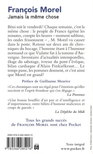 Béni soit le vendredi ! Chaque semaine, c'est la même chose : le peuple de France égrène les minutes, compte les heures - moment sublime, les ondes frissonnent - , M. Morel va causer dans le poste. Retour sur deux ans de chroniques du bocage, l'homme étant à l'humour normand ce que Vialatte fut à la tomme d'Auvergne. Inventaire d'actualités intemporelles, éloge du sabotage, ivresse du pont-l'évêque, bilan cardiaque d'Alain Finkielkraut... Le temps passe, les pommes donnent, et c'est ainsi que Morel est grand !