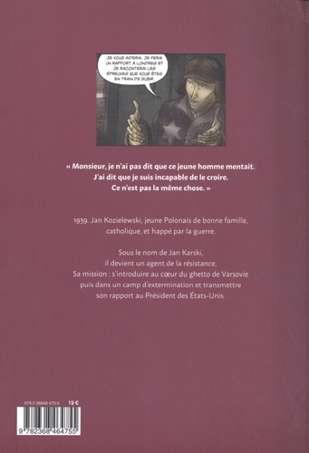 " Monsieur, je n'ai pas dit que ce jeune homme mentait. J'ai dit que je suis incapable de le croire. Ce n'est pas la même chose. " Ainsi s'exprima Felix Frankfurter, juge de la Cour suprême des Etats-Unis, lui-même juif, après avoir fait écouter le récit de Karski au Président Roosevelt en 1943. 1939. Jan Kozielewski, jeune Polonais de bonne famille, catholique, est happé par la guerre. Sous le nom de Jan Karski il devient un agent de la résistance. Sa mission : s'introduire au coeur du ghetto de Varsovie puis dans un camp d'extermination et transmettre son rapport au Président des Etats-Unis. Peu de livres relatent l'histoire - extraordinaire, incroyable et passionnante - de Karski. Personne n'en a tiré un film, personne ne l'a catapultée sous les projecteurs des médias et de la mémoire. Marco Rizzo et Lelio Bonaccorso lui rendent hommage à travers ce roman graphique. Prix Cezam Ile-de-France 2016