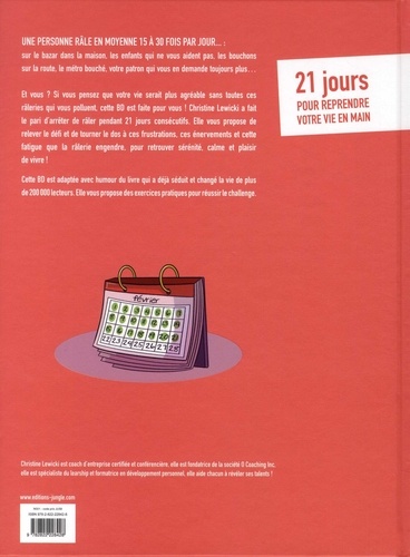 Une personne râle en moyenne 15 a 30 fois par jour... : sur le bazar dans la maison, les enfants qui ne vous aident pas, les bouchons sur la route, le métro bouché, votre patron qui vous en demande toujours plus... Et vous ? Si vous pensez que votre vie serait plus agréable sans toutes ces râleries qui vous polluent, cette BD est faite pour vous ! Christine Lewicki a fait le pari d'arrêter de râler pendant 21 jours consécutifs. Elle vous propose de relever le défi et de tourner le dos à ces frustrations, ces énervements et cette fatigue que la râlerie engendre, pour retrouver sérénité, calme et plaisir de vivre ! Cette BD est adaptée avec humour du livre qui a déjà séduit et changé la vie de plus de 200 000 lecteurs. Elle vous propose des exercices pratiques pour réussir le challenge.
