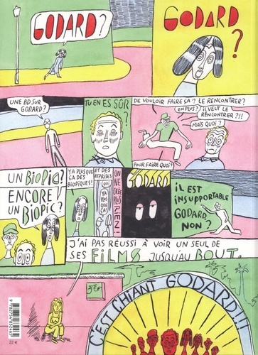 Philippe Dupuy part à la rencontre du cinéaste Jean-Luc Godard. Une rencontre improbable a priori, mais rien n'est impossible en bande dessinée ! 100 pages pour évoquer avec lui le processus de création, la singularité de toute démarche artistique, dans un dialogue ludique et didactique au pays de la bande dessinée et du cinéma. Une exploration des grandes questions qui passionnent Philippe Dupuy en tant qu'artiste : l'acte de création, faire, faire lire, le statut de l'artiste dans l'histoire de l'art.